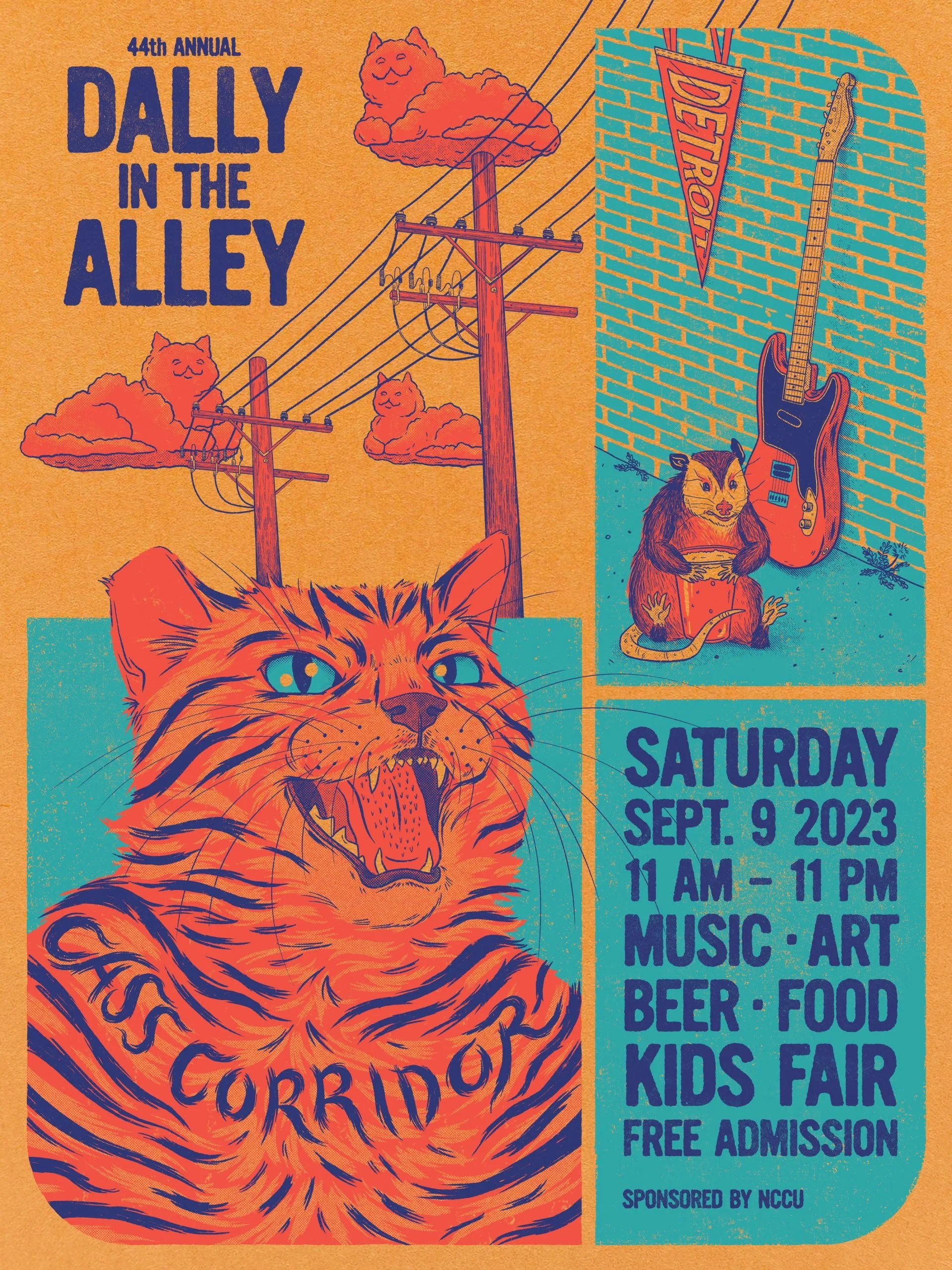Illustrated poster for the 44th Annual Dally in the Alley event featuring a large, roaring orange tabby cat with blue eyes and the words 'Escape or' on its body. The top left shows power poles with cats sitting on the clouds above. The top right cont