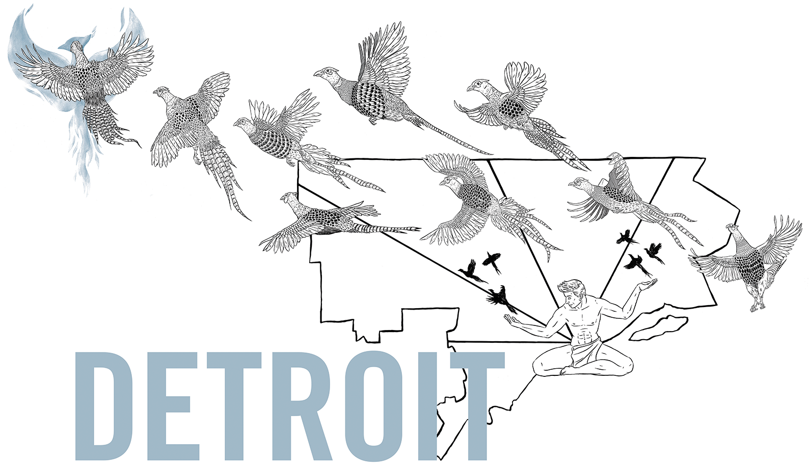 Illustration of multiple birds flying over a map of Detroit, Michigan, with a person sitting in a meditative pose and the word "DETROIT" at the bottom.