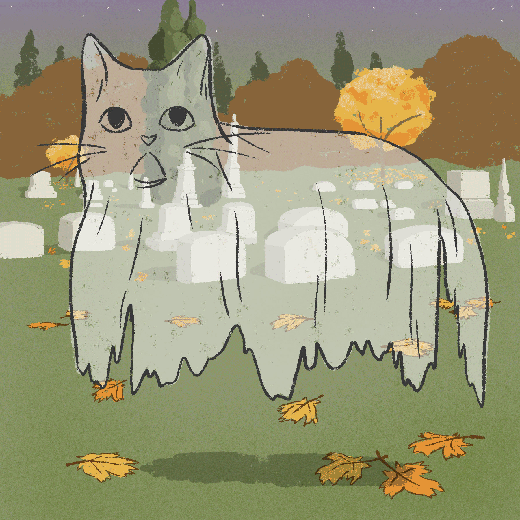 A ghostly figure of a cat with a translucent body revealing a cemetery landscape in the background, with tombstones and autumn trees, under a cloudy sky.